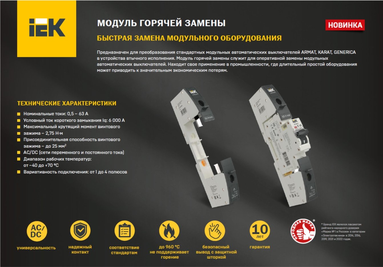 В промышленном секторе каждая минута простоя — это прямые убытки. Чтобы свести техническое обслуживание к минимуму, компания IEK представляет модуль горячей замены серии ARMAT. Это решение превращает стандартные автоматические выключатели в устройства втычного исполнения, позволяя производить их замену мгновенно и без лишних манипуляций.